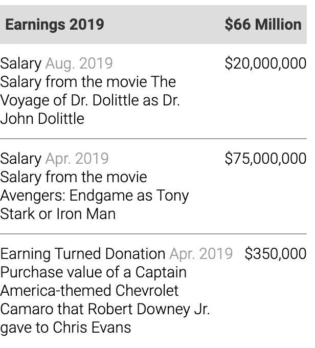 ข้อมูลจาก  therichest.com เว็บไซต์ธุรกิจชื่อดังได้รายงานรายได้ของนักแสดงประจำปี 2019 โดยข้อมูลของโรเบิร์ต ดาวนีย์ จูเนียร์ ได้ระบุว่าเมื่อปีที่ผ่านมาเขามีรายได้ตัวเลขอย่างเป็นทางการคือ  66 ล้านดอลล่าร์สหรัฐฯ นอกจากนี้ยังมีระบุอีกว่า โรเบิร์ต ยังได้รับเงินค่าตัวจากการแสดงในบท Iron Man ใน Avengers Endgame ราว 75 ล้านดอลล่าร์สหรัฐฯ และค่าตัวจากการแสดงเรื่อง Dolittle อีก 20 ล้านดอลล่าร์สหรัฐฯ โดยมีการประเมินว่า โรเบิร์ต ดาวนีย์ จูเนียร์ อาจจะมีรายได้และสินทรัพย์รวมสุทธิอยู่ราว 300 ล้านดอลล่าร์สหรัฐฯ
